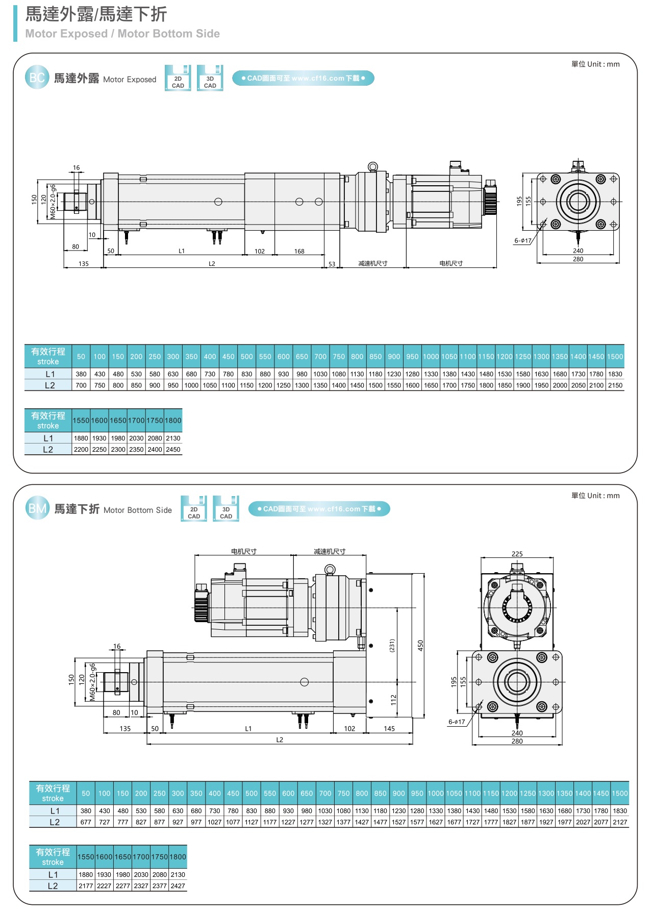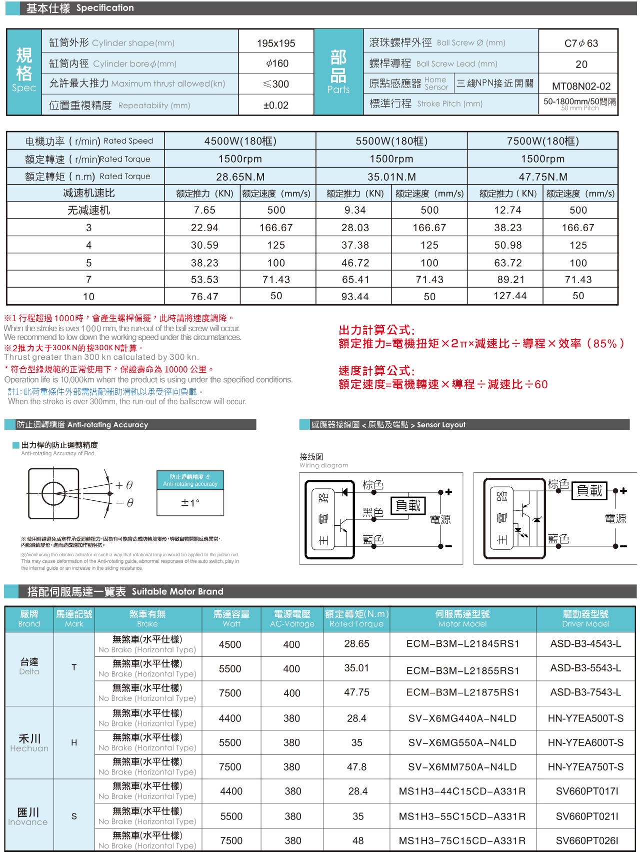 规格特性:标配电机:伺服4.5KW/5.5KW/7.5KW 重覆精度:±0.02(mm) 螺杆导程:20(mm) 最大推力:≤300kN 最大行程:≤1800mm