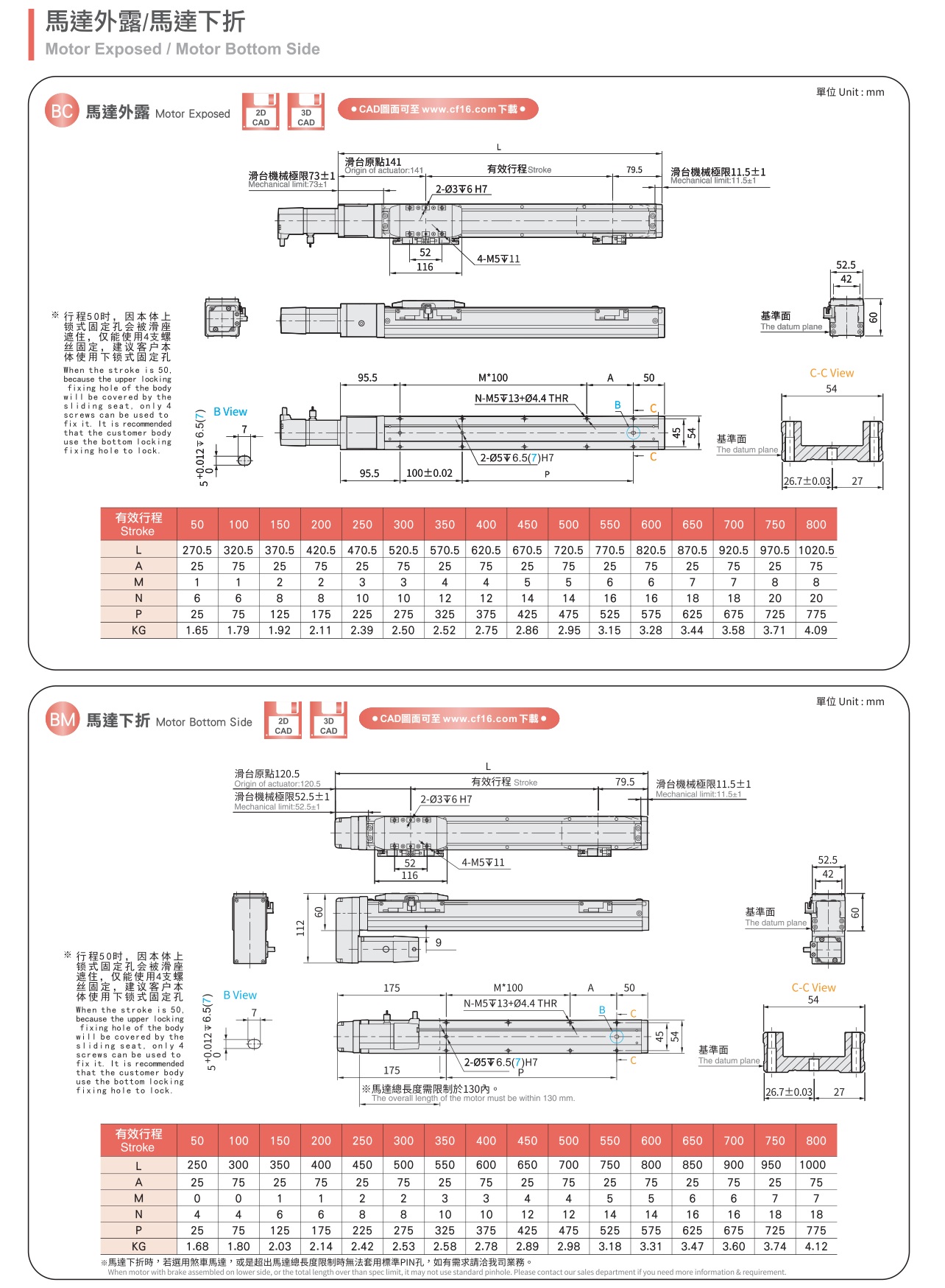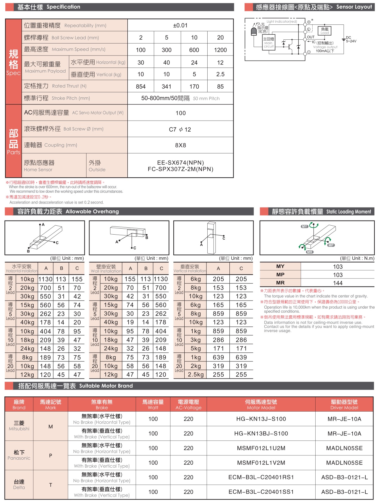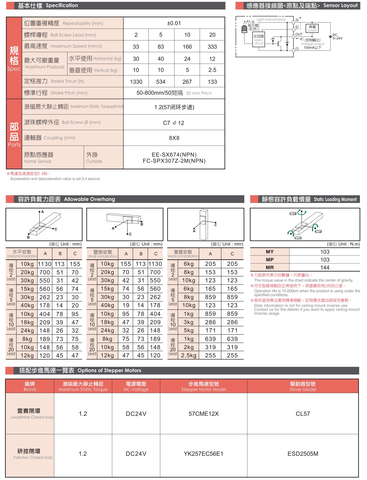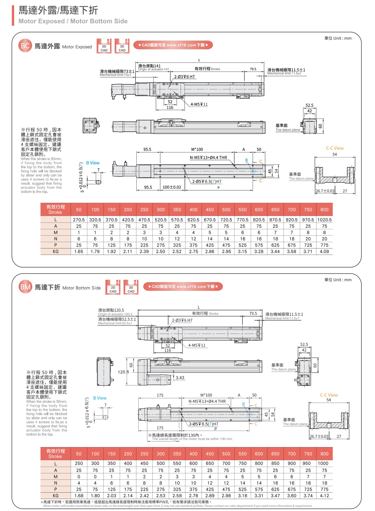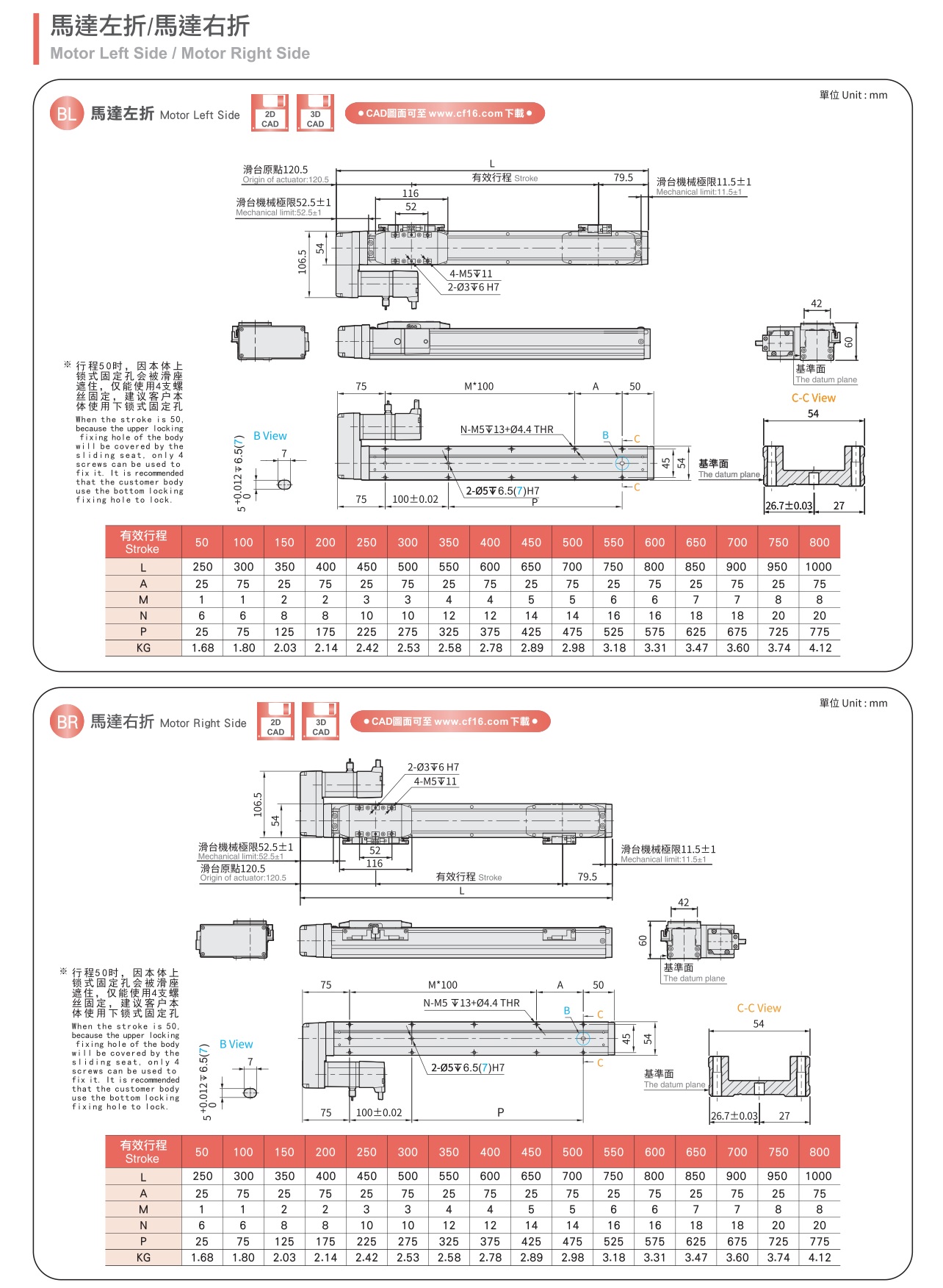 产品名称:轨道内嵌式螺杆滑台产品型号:FG5产品特色:重覆精度:±0.01(mm)最大可搬重量:水平使用:40(kg)最大可搬重:垂直使用:10(kg)规格特性:标配电机:闭环步进57、伺服100W重覆精度:±0.01(mm)螺杆导程:2、5、10、20(mm)最高速度:1000(mm/s)最大可搬重量水平使用:40(kg)最大可搬重量垂直使用:10(kg)标准有效行程:50~800(mm)/(50间隔)