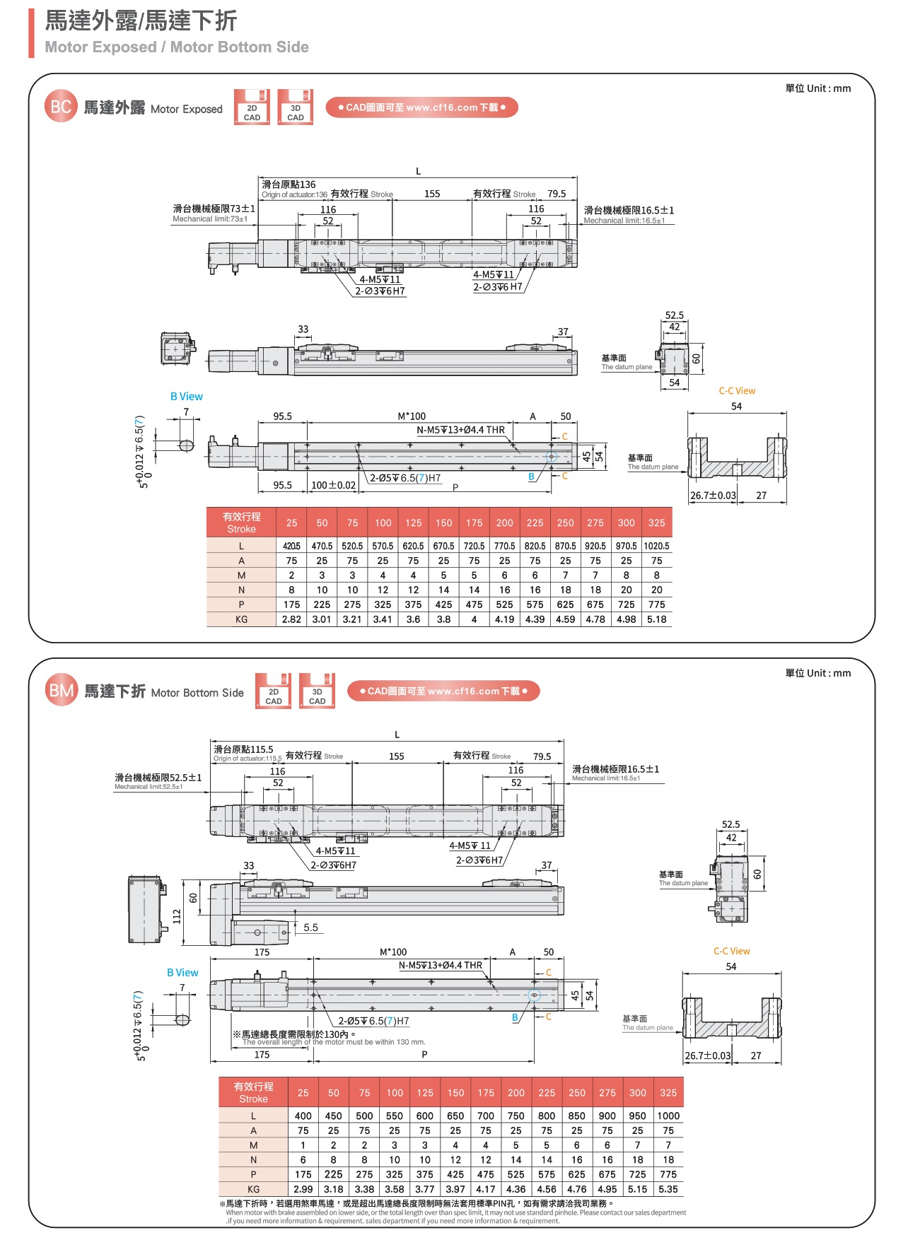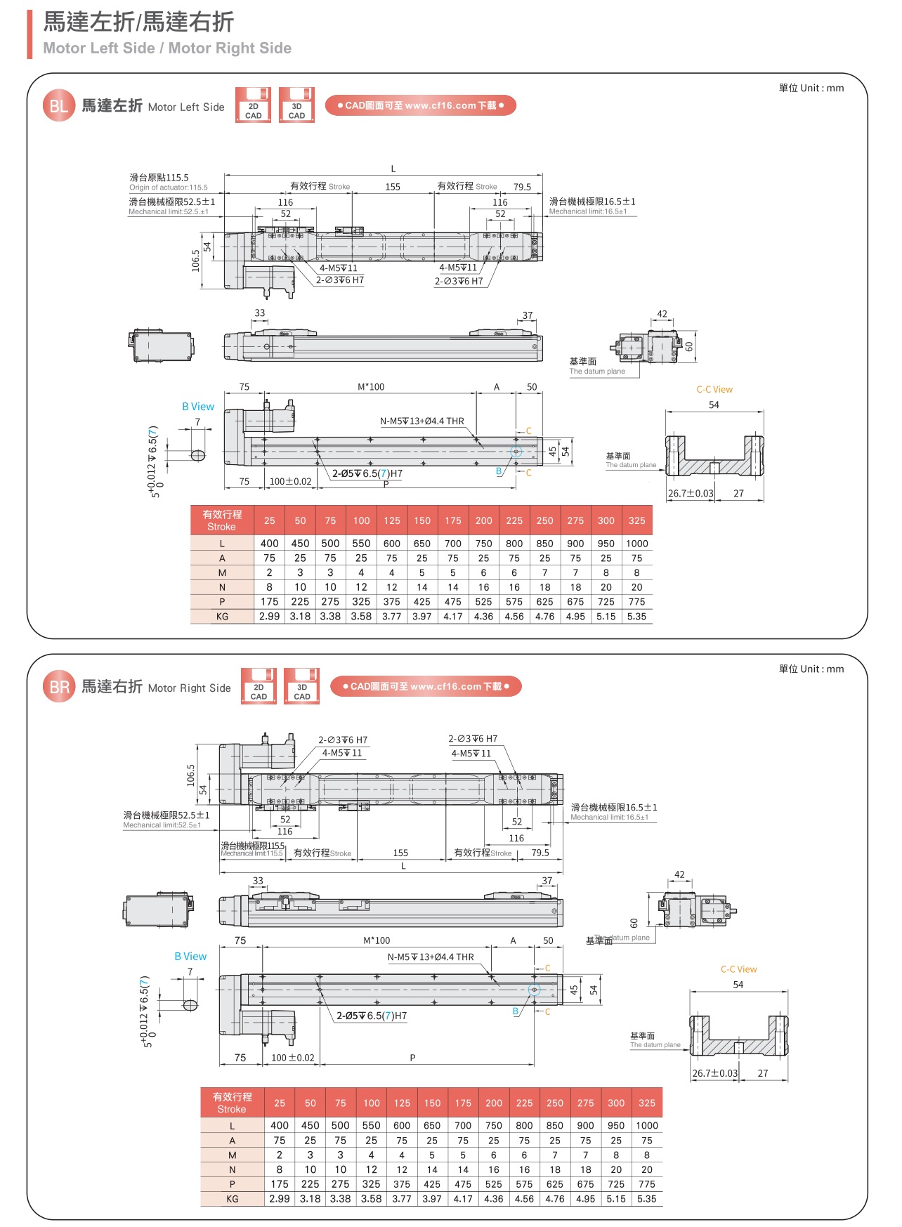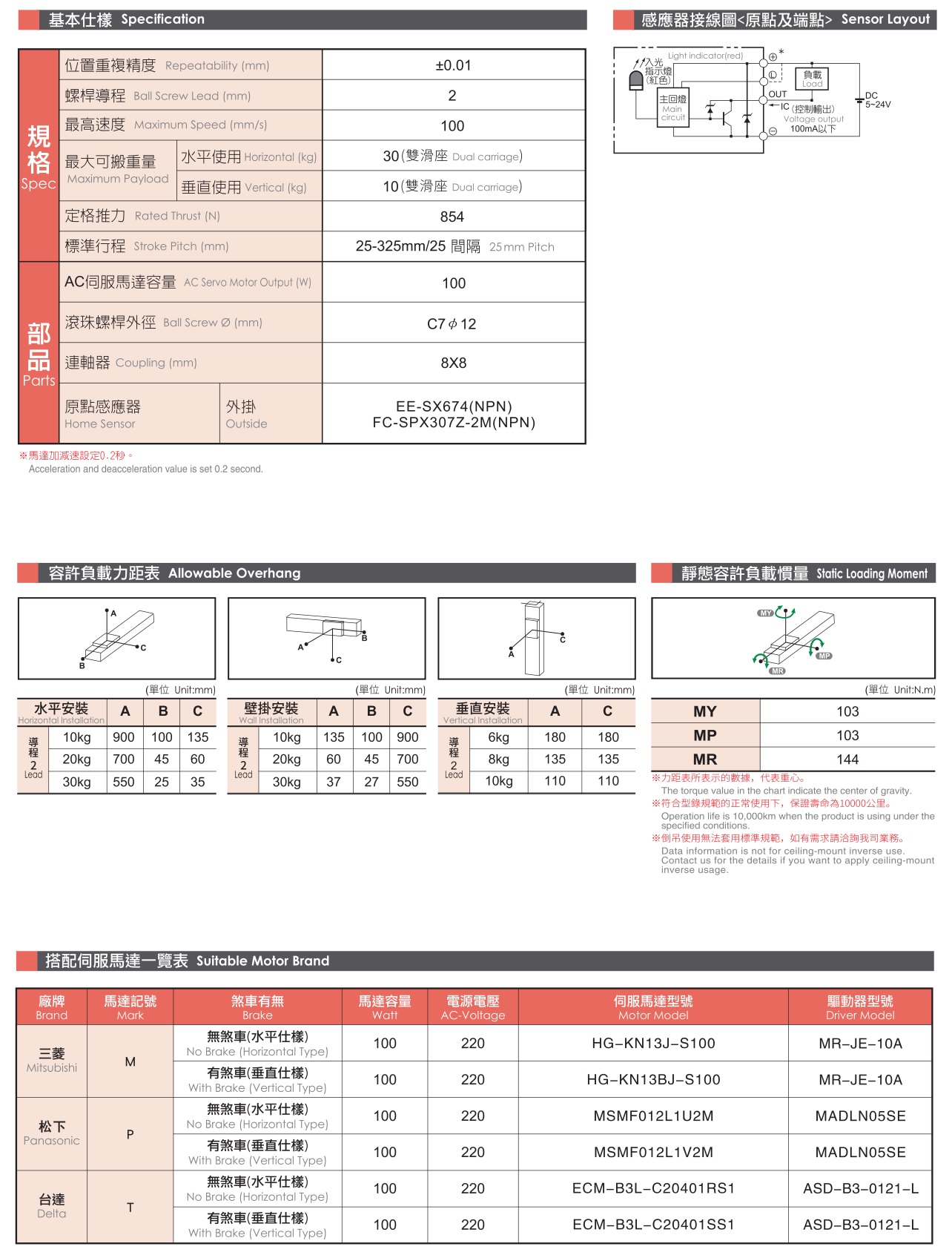 产品名称:轨道内嵌式螺杆滑台产品型号:FG5S产品特色:重覆精度:±0.01(mm)最大可搬重量:水平使用:30(kg)最大可搬重:垂直使用:10(kg)规格特性:标配电机:伺服100W重覆精度:±0.01(mm)螺杆导程:2(mm)最高速度:100(mm/s)最大可搬重量水平使用:30(kg)最大可搬重量垂直使用:10(kg)标准有效行程:50~325(mm)/(25间隔)