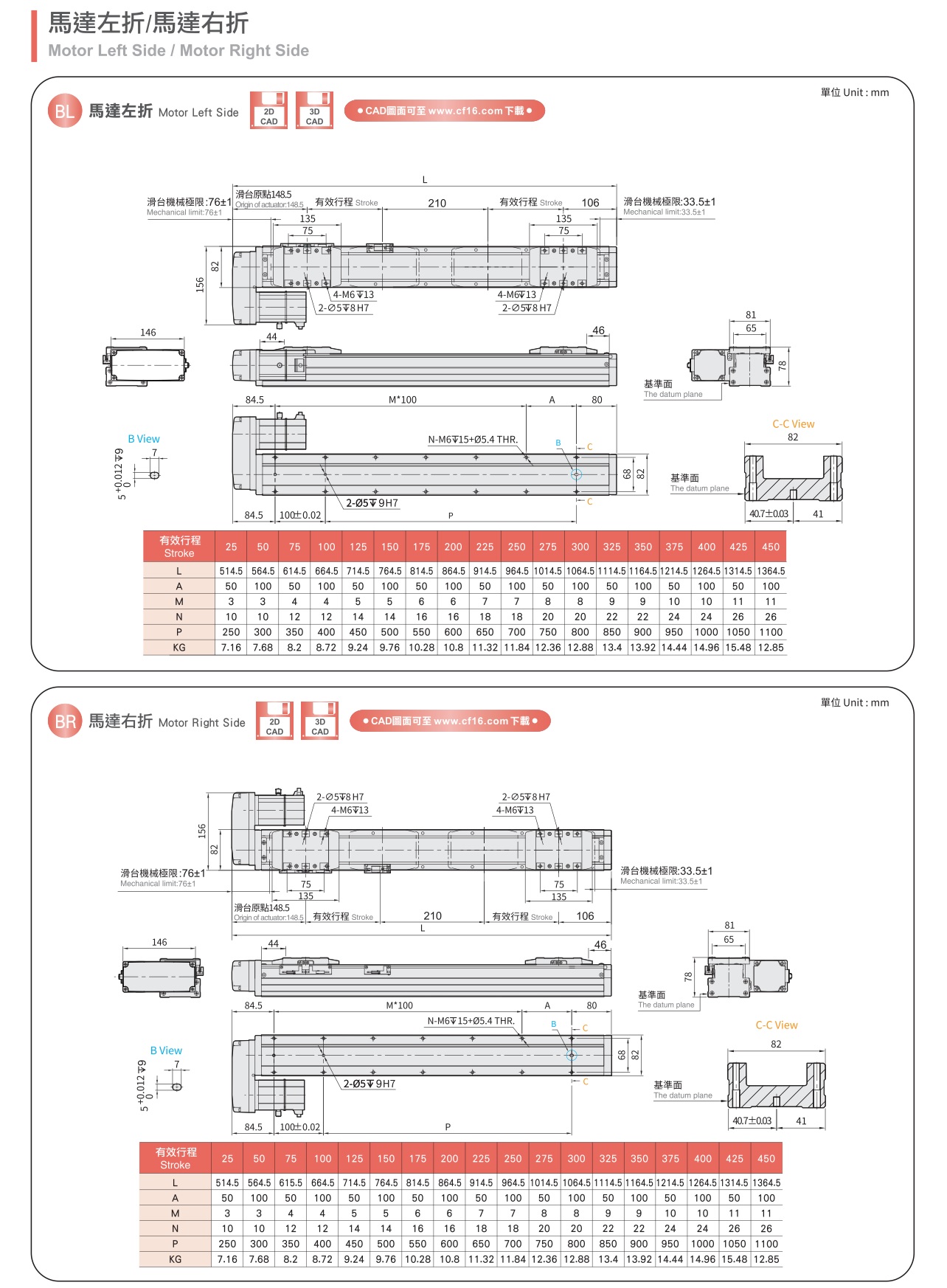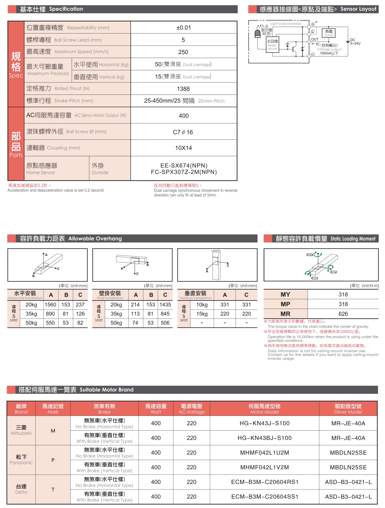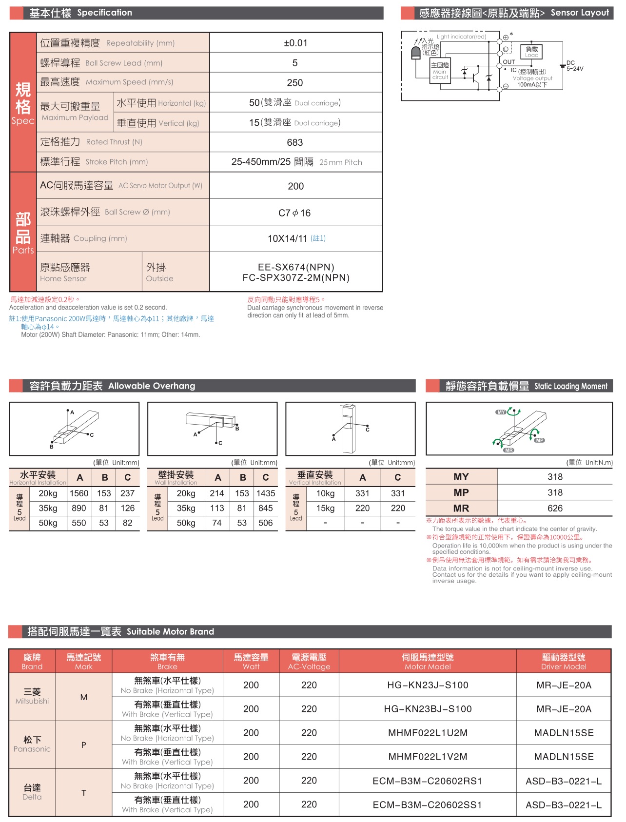 产品名称:轨道内嵌式螺杆滑台产品型号:FG8S产品特色:重覆精度:±0.01(mm)最大可搬重量:水平使用:50(kg)最大可搬重:垂直使用:15(kg)规格特性:标配电机:伺服200W 、400W重覆精度:±0.01(mm)螺杆导程:5(mm)最高速度:250(mm/s)最大可搬重量水平使用:50(kg)最大可搬重量垂直使用:15(kg)标准有效行程:50~250(mm)/(50间隔)
