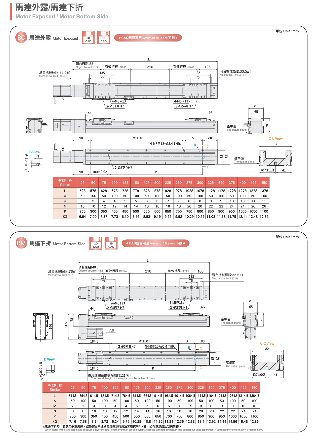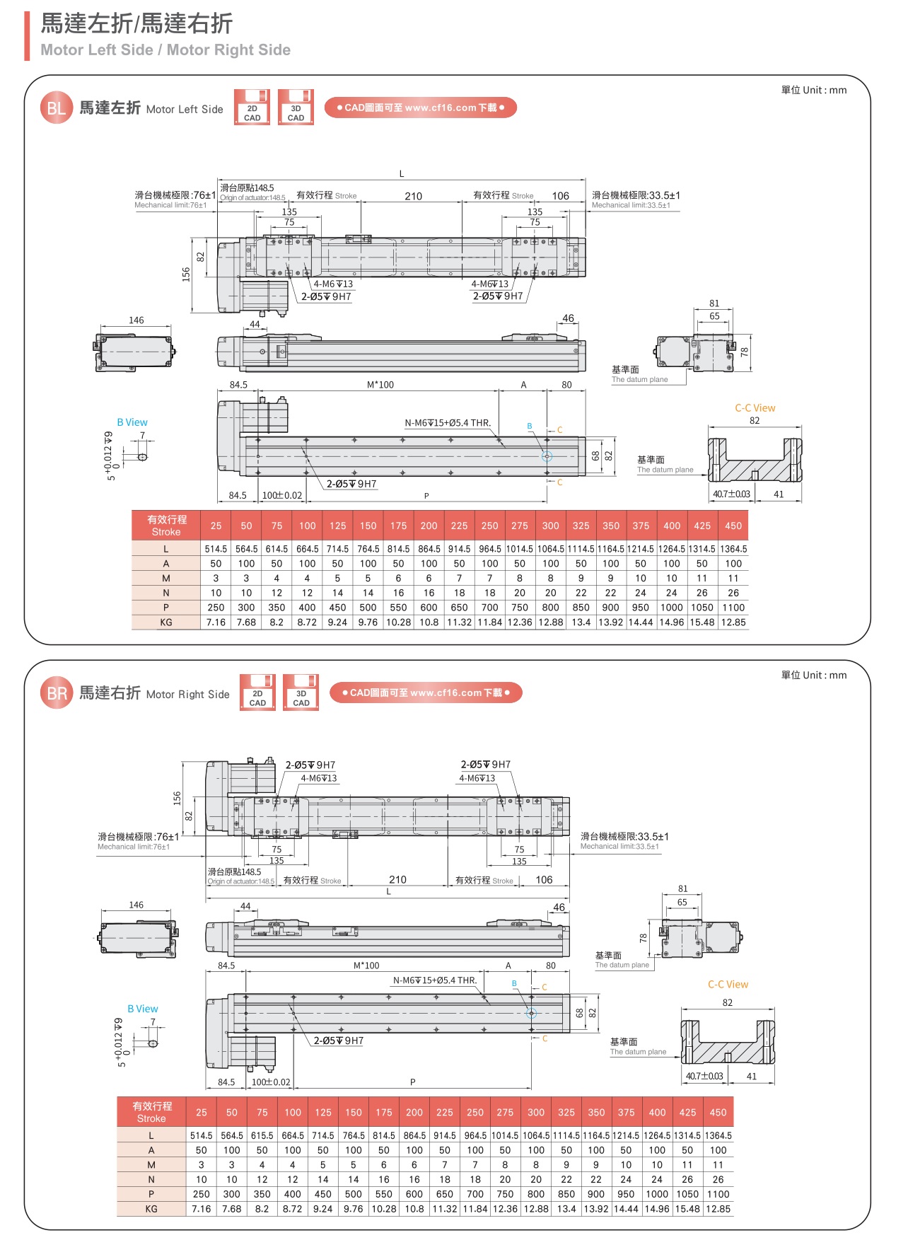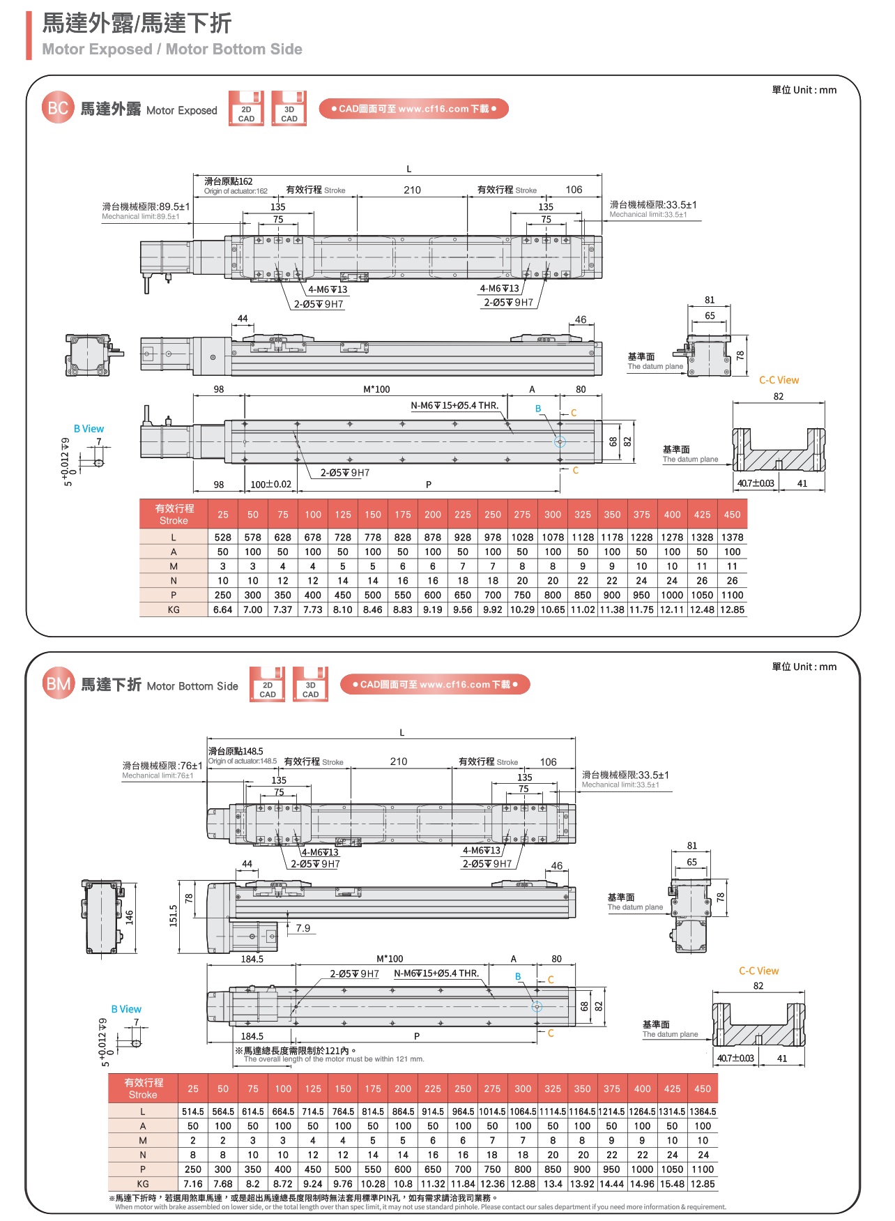 产品名称:轨道内嵌式螺杆滑台产品型号:FG8S产品特色:重覆精度:±0.01(mm)最大可搬重量:水平使用:50(kg)最大可搬重:垂直使用:15(kg)规格特性:标配电机:伺服200W 、400W重覆精度:±0.01(mm)螺杆导程:5(mm)最高速度:250(mm/s)最大可搬重量水平使用:50(kg)最大可搬重量垂直使用:15(kg)标准有效行程:50~250(mm)/(50间隔)